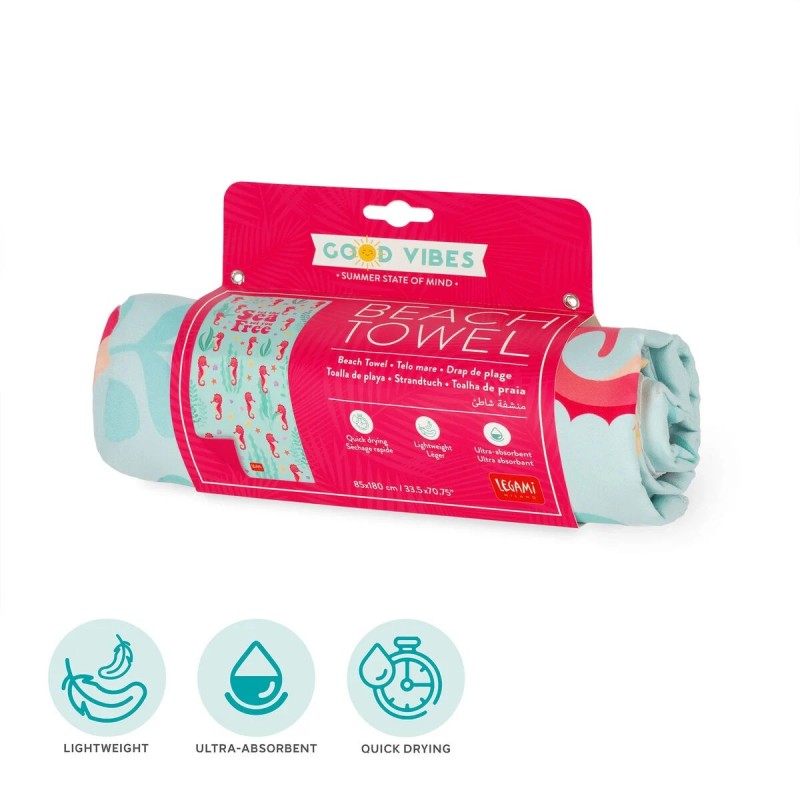 Διεκδικήστε τον χώρο σας στην παραλία με στυλ με την πετσέτα παραλίας Legami – Seahorse. Όσο πρακτική όσο και κομψή, η πετσέτα είναι συμπαγής, ελαφριά και διπλής όψης, επομένως δεν θα είναι πολύ για να τη μεταφέρετε. Γρήγορο στέγνωμα και εξαιρετικά απορροφητικό, θα μπορείτε να κάνετε ηλιοθεραπεία, να χαθείτε στο καλοκαιρινό σας διάβασμα και να απολαύσετε τις καλές δονήσεις. Διαθέτει διασκεδαστική εκτύπωση στη μία πλευρά και μπλοκ χρώματος στην άλλη.